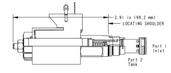 This FLeX Series solenoid-operated, 2-stage, balanced relief cartridge is a pressure regulating valve. The valve is normally vented. When vented (de-energized), the pressure drop from the inlet (port 1) to tank (port 2) is typically 100 psi.Energizing the solenoid activates the relief function. In relief mode, the valve opens to tank (port 2), throttling flow to regulate the pressure when the pressure at the inlet (port 1) reaches the valve setting. The setting is adjustable with an adjust screw.